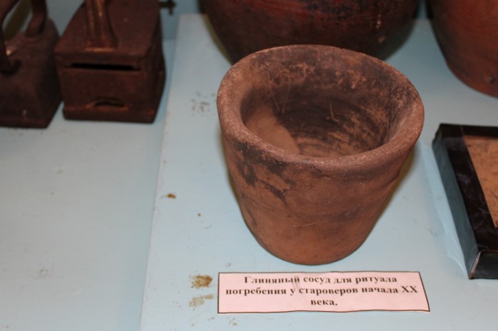 В музее нашей школы находится глиняный горшок грубой обработки, служивший староверам как ритуальный предмет проводов в последний путь (после смерти) умерших жителей. В процессе похорон в горшок накладывали горящие угли из печи, и устанавливали на могиле покойного. Это объяснялось тем, что он тем самым будет помнить обратный путь домой и память его семьи о нём.